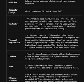 “Create a Product Requirement Document (PRD) for an e-commerce website planning to switch its payment processing from PayPal to Stripe. The PRD should include: Overview: A brief introduction to the project, including the objective and the need for switching to Stripe. Features and Functionalities: Outline the key features and functionalities that Stripe integration will bring to the e-commerce platform. Consider aspects like customer checkout process, subscription management, and fraud detection. Technical Requirements: Detail the technical specifications and requirements for integrating Stripe, including any changes needed in the current system architecture, APIs to be used, and data flow diagrams. Timeline and Milestones: Propose a project timeline with major milestones, including development, testing, and deployment phases. Risks and Mitigation Strategies: Identify potential risks associated with the Stripe integration process and suggest mitigation strategies for each identified risk. Work Prioritization: Describe how the tasks will be prioritized, including any dependencies between tasks. Your response should be concise, focusing on the key elements necessary for understanding and executing the transition from PayPal to Stripe. Please create a table for the response”