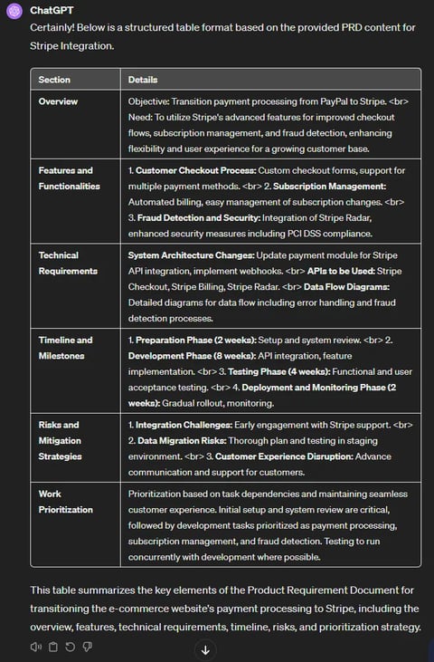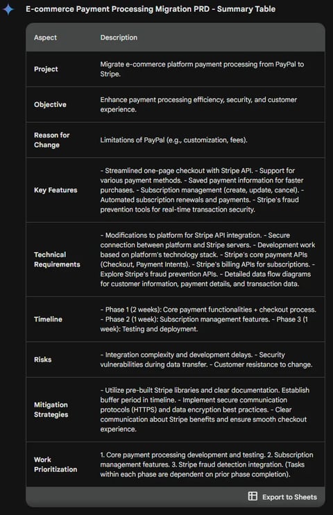 The Experiment: Create a PRD for an E-commerce website that wants to switch its payment processing from PayPal to Stripe.